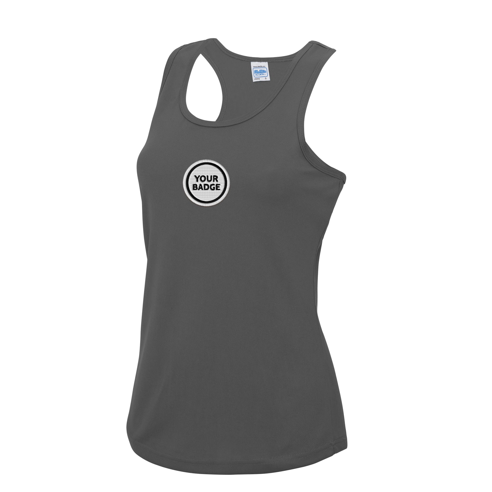 Girlie fit. Racer back style. Curved back hem for added comfort. Neoteric texture fabric with inherent wickability and quick drying properties. Self-fabric binding around neckline and armholes. UPF 30+ UV protection.